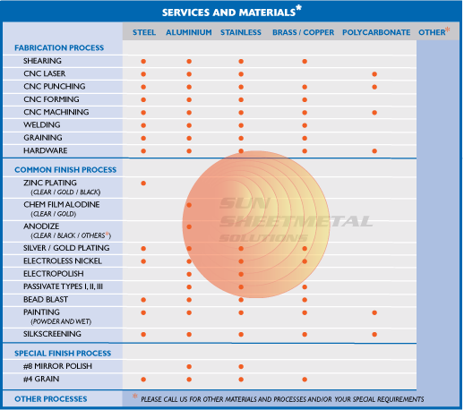 As illustrated by the table, we work with the full range of materials ... steel, aluminum, stainless, brass and copper, polycarbonate, and others. Our fabrication processes include CNC laser, punching, forming, and machining; shearing,; welding; graining; and hardware. We provide the common finishes...zinc plating: chem film alodine: anodize; sliver/gold plating; electroless nickel; electropolish; passivate types I, II, and III; bead blast; painting; and silkscreening ... plus special finishes: #8 mirror polish and # 4 grain. The Services and Materials table shows the available combinations of these processes and materials. Please call us for other materials and processes and/or your special requirements.